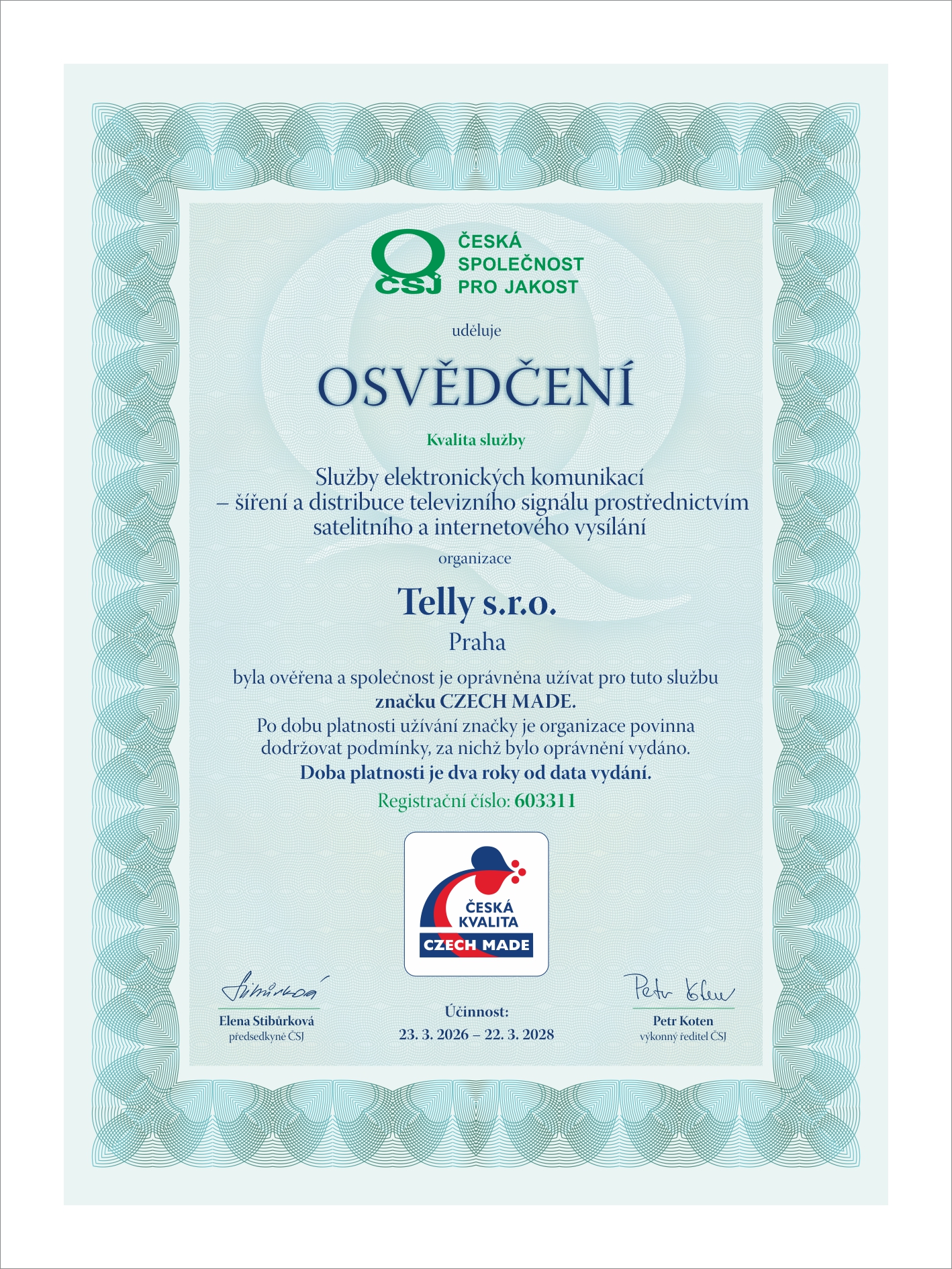 „Těší nás, že se společnost Telly s.r.o. stala novým držitelem značky CZECH MADE a zároveň úplně prvním držitelem tohoto náročného ocenění ve svém oboru. Z výsledků hodnocení je zřejmé, že má tato společnost velmi dobře nastavené procesy a systém řízení, který je připraven obstát i v náročných kritériích hodnocení. Zaměstnanci zároveň tvoří sehraný kompetentní tým, který významně přispívá k celkové kvalitě poskytovaných služeb. Byli jsme pozitivně překvapeni vysokou mírou připravenosti společnosti na hodnocení, dále jejím důrazem na kvalitu a inovace.“ uvedl Petr Koten, výkonný ředitel České společnosti pro jakost, která je správcem značky CZECH MADE.
